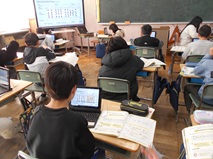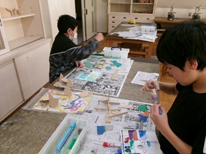 5年生の図工の学習で、電動糸のこぎりを使って木をたくさん切りました。波のように切ったり、のこぎりでは切れない形に切ったり…切り終わった後は、木と木を組み合わせました。「竜のように見える!」「ペンギンに見える!」など、糸のこでしか表すことのできない形を作ることができました。