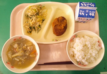 今日は全国学校給食週間最終日です。県北地方の郷土料理「ねぎぬた」と、郷土の偉人「荻野吟子」にちなんだ「吟子汁」を入れました。ねぎぬたは、細切りの蒲鉾とゆでたネギを、ごまみそダレで和えました。苦手な子が多いかな、と思いましたが、みんながんばって食べていました。