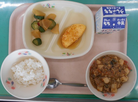 12月1日の給食 2025年12月1日 最終更新日時 : 2025年12月2日 江南北小職員 ごはん 牛乳 マーボー豆腐 オムレツの甘酢あんかけ きゅうりと大根のピリっと漬け 今日のオムレツは中華風に甘酢あんかけにしました。
