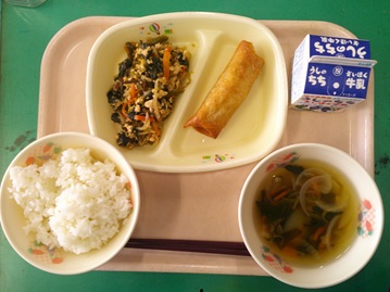 4月10日の給食 2026年4月10日 最終更新日時 : 2026年4月10日 江南北小職員 牛乳 ごはん ビビンバの具 春巻き わかめスープ 今日から4月の給食がスタートします。ビビンバは韓国料理です。 白いご飯の上にビビンバの具をのせて、ご飯と混ぜて食べます。