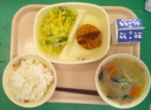 給食のマーボー豆腐には、写真で見るとわかりにくいですが、たけのこ、にんじん、干しシイタケ、ねぎ、にらなどの野菜がたっぷり入っています。給食センターでは、朝から野菜をみじん切りにする包丁の音が、トントン、トントン・・と響いていました。やさしい辛みでおいしいマーボー豆腐です。