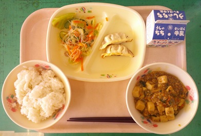 給食のマーボー豆腐には、写真で見るとわかりにくいですが、たけのこ、にんじん、干しシイタケ、ねぎ、にらなどの野菜がたっぷり入っています。給食センターでは、朝から野菜をみじん切りにする包丁の音が、トントン、トントン・・と響いていました。やさしい辛みでおいしいマーボー豆腐です。
