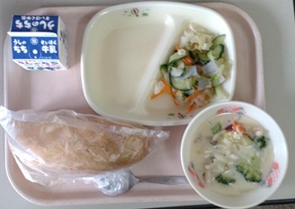 秋の味覚ポタージュには、シメジやサツマイモという秋が旬の食べ物が入っています。サラダのこんにゃくは、熊谷市内のこんにゃく屋さんから仕入れたものです。さっぱりしておいしかったです。子供たちもよく食べていました。