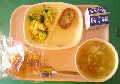 給食のグラタンは、ジャガイモから作った食べられるカップのグラタンです。最近風がとても冷たいですね。こんな日には、ポトフのような煮込み料理がぴったりです。食べるとポカポカ体が温まりますよ。