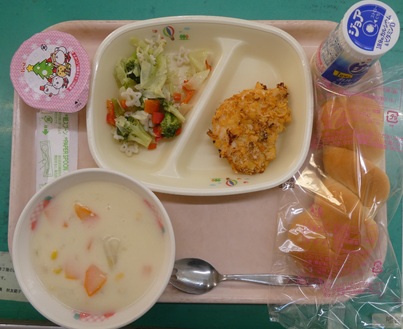 今日はクリスマス献立です。チキンをいつもより、少し大きくしてみました。粉チーズを加えたノンエッグマヨネーズで下味をつけパン粉とコーンフレークを砕いた衣をまぶしてオーブンで焼きました。クリスマスサラダには星形のマカロニを使っています。