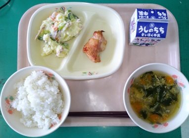 今日のサラダはポテトサラダです。鹿児島県産の新ジャガを使っておいしいサラダができました。保護者のかたもお気づきのように、最近ジャガイモやニンジン、玉ねぎの値段が高いです。好き嫌いしないで食べてほしいなぁ…と思います。